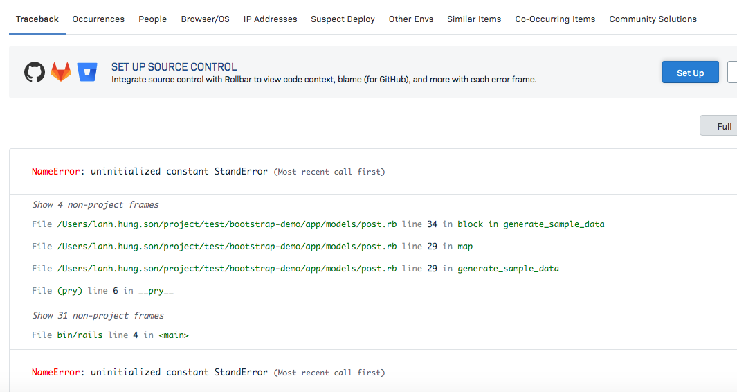 Rollbar là một dịch vụ hỗ trợ các lập trình viên, cung cấp khả năng báo cáo các exception theo thời gian thực khi hệ thống hoạt động và theo dõi quá trình deploy hệ thống.