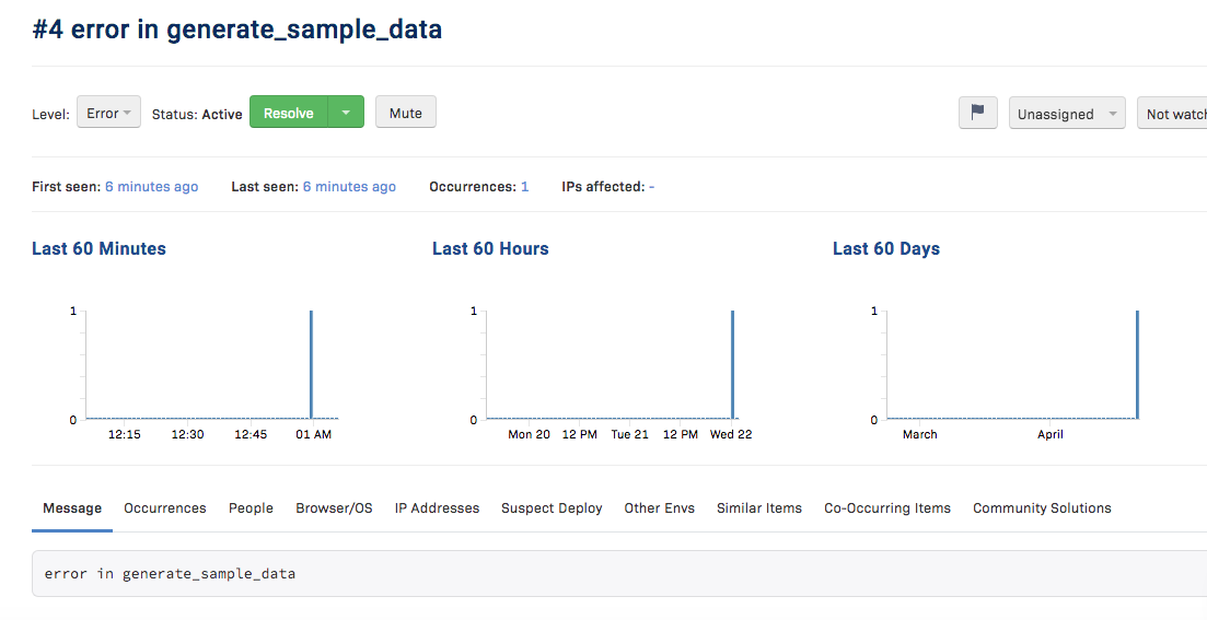 Nếu thêm như thế, thì khi vào trang chủ Rollbar, ta sẽ xem được thông báo lỗi của error đấy chỉ có mỗi message error