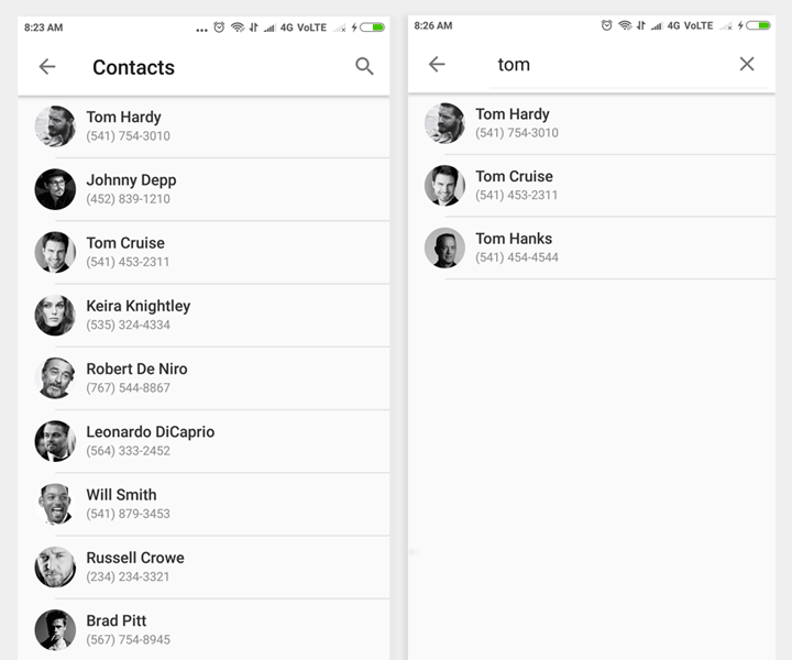 Dưới đây là một ví dụ về phương thức getFilter () để tìm kiếm một danh bạ theo tên hoặc số điện thoại từ danh sách các danh bạ :