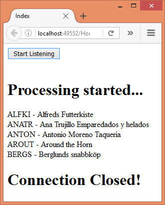 Trong trường hợp này thay vì sử dụng phương thức Content() để trả về IActionResult, code sử dụng đối tượng Response. Thuộc tính ContentType của Response được set tới text/event-stream. Một vòng lặp duyệt qua tất cả các đối tượng Customer. Customer được chuyển đổi thành JSON như trước và được ghi tới Response stream sử dụng phương thức WriteAsync. Phương thức Flush() của Response body đảm bảo rằng dữ liệu được đẩy đến trình duyệt. Phương thức Close() đóng Response stream do đó kết thúc event source.