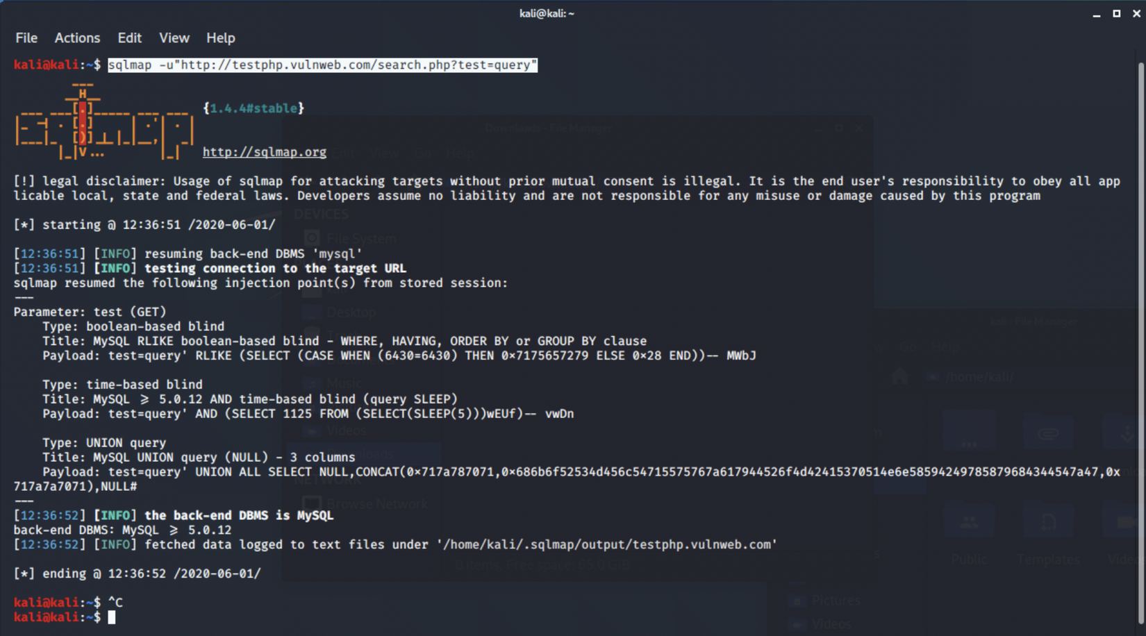 sqlmap –u”http://testphp.vulnweb.com/search.php?test=query”