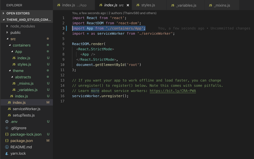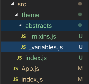 Trong folder src mình tạo folder theme bên trong là file index.js và folder abstracts với 2 file mixins.js và _variables.js.