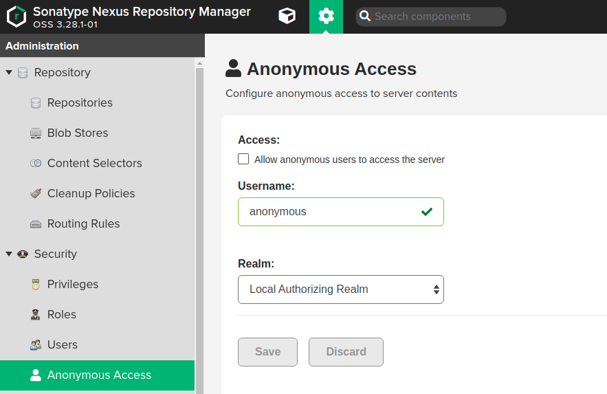 Như mọi người có thể thấy trên hình bên dưới, trạng thái hiện tại của Anonymous Access đang off, nghĩa là người dùng phải authorized mới dùng được thư viện này (bảo mật repository)