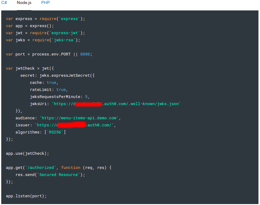 Để đạt được mục đích là bảo mật API, chúng ta cần bổ sung thêm vài cái: sử dụng help function expressJwtSecret từ thư viện jwks-rsa để truy vấn JSON Web Key Set (JWKS) endpoint của Auth0. Endpoint này có một bộ keys chứa các public key mà ứng dụng có thể sử dụng để xác thực JSON Web Token (JWT) do authorization server cấp và ký bằng thuật toán sign RS256.