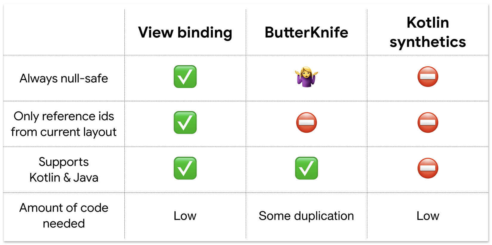- Null safety: Vì view binding tạo tham chiếu trực tiếp tới view, do đó không có rủi ro như Null Pointer Exception khi invalid view ID.