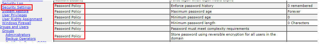 Từ thư mục kết quả, trong mục “Catagories”, tìm đến mục “Security Setting” tìm đến mục con “Password Policy”. Đảm bảo rằng tất cả các thư mục này được bật phù hợp với tiêu chuẩn đánh giá CIS hoặc đã được chọn lựa chức năng kỹ càng theo nhu cầu sử dụng. Tránh tối đa các trường hợp ghi nhận “0” hoặc “Forever