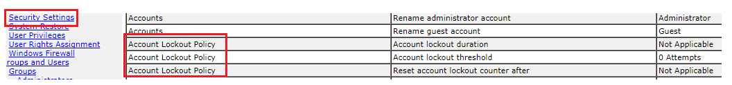 Từ thư mục kết quả, trong mục “Catagories”, tìm đến mục “Security Setting” tìm đến mục con “Account Lockout Policy”. Đảm bảo rằng tất cả các thư mục này được bật phù hợp với tiêu chuẩn đánh giá CIS hoặc đã được chọn lựa chức năng kỹ càng theo nhu cầu sử dụng. Tránh tối đa các trường hợp không áp dụng hay các trường “0”