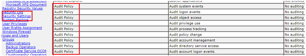 Từ thư mục kết quả, trong mục “Categories”, tìm đến mục “Security Setting” tìm đến mục con “Audit Policy”. Đảm bảo rằng tất cả các thư mục này được bật phù hợp với tiêu chuẩn đánh giá CIS hoặc đã được chọn lựa chức năng kỹ càng theo nhu cầu sử dụng. Tránh tối đa các trường hợp ghi nhận “No auditing”