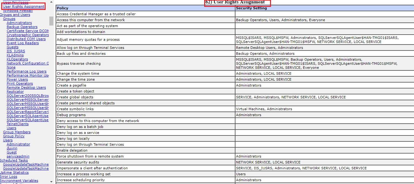 Từ thư mục kết quả, trong mục “Catagories”, tìm đến mục “User Right”. Tiến hành rà soát và kiểm tra các nhóm người dùng tại từng phân quyền đã phù hợp theo tiêu chuẩn đánh giá CIS hay chưa hoặc đã phù hợp theo đúng yêu cầu của tổ chức hay chưa. Tránh tối đa việc có nhóm “Everyone” trong các phân quyền, đặc biệt là các phân quyền có ảnh hưởng lớn tới hệ thống.
