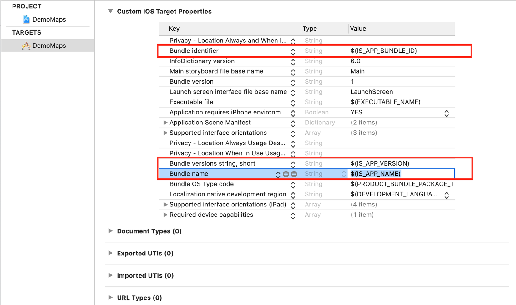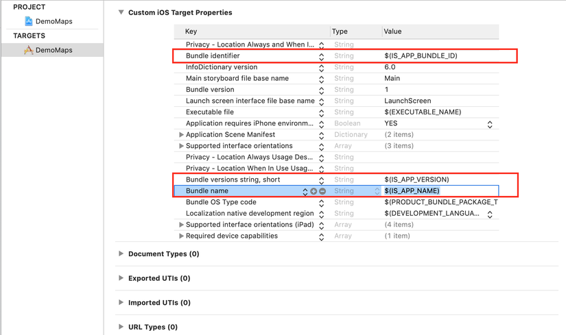 Bạn có thể sử dụng các biến đã định nghĩa của bạn trong project setting, info.plist và entitlement files. Ví dụ, chúng ta sẽ sử dụng bên trong file info.plist để thay đổi app name, app versioin và bundle identifier như hình bên dưới: