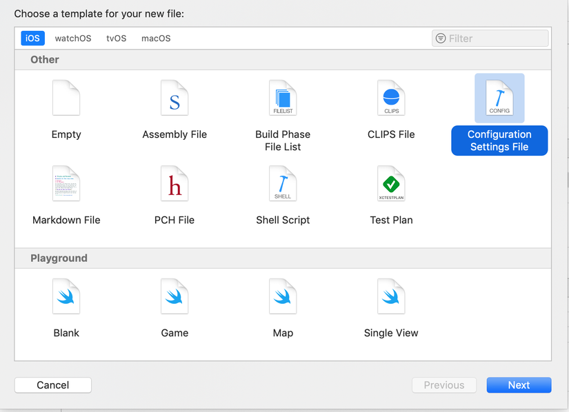 Bây giờ hãy trở lại project của bạn để tạo .xcconfig file .chọn project của bạn -> click chuột phải -> new file -> configuration Setting File. Ở màn hình tiếp theo bạn nhập vào tên của file và hãy đảm bảo rằng bạn đã uncheck hết các checkbox nếu bạn không muốn bao gồm các bundle của app bên trong file setting.