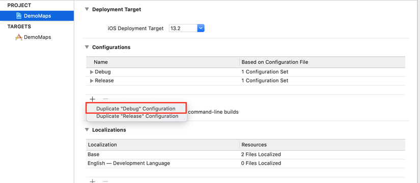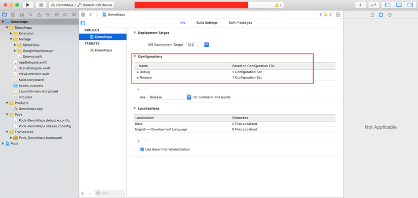 Đầu tiên, hãy sử dụng xcode tạo new project hoặc nếu bạn đã có thì bắt đầu bằng project đã có trên máy tính của bạn. Chọn phần đầu tiên của dự án. Sau khi chọn bạn sẽ thấy trong phần configurations sẽ có 2 chế độ Debug và Release. Nếu trước đó bạn không biết thì cái này có nghĩa là bạn có thể tạo một bản build cho debug và một bản khác cho release với cài đặt khác nhau.