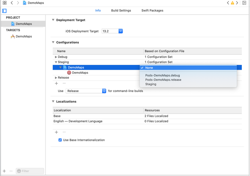 Quay lại màn hình info project. Bên dưới configuration xổ Staging ra sau đó chọn file configuration chọn xcconfile "Staging".