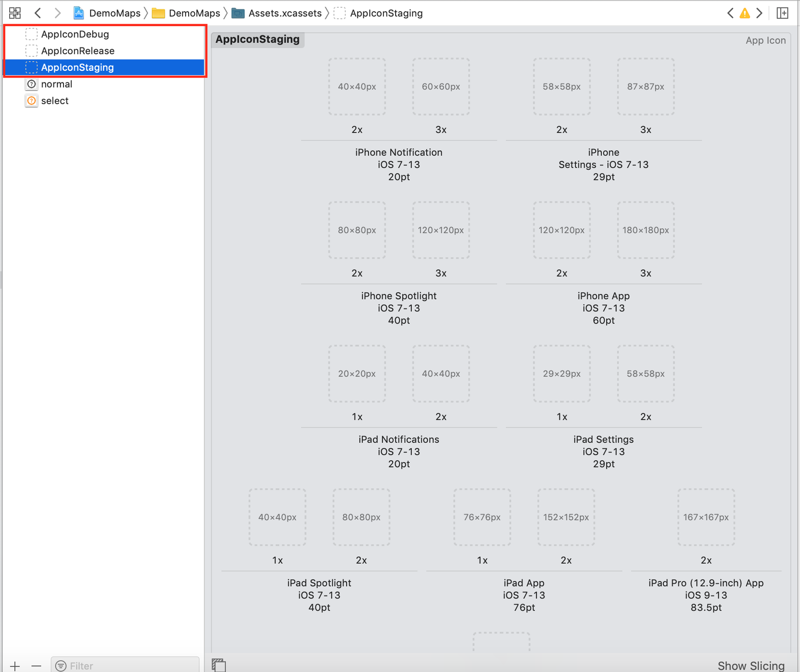 Sau đó, tạo một vài bộ icon app mới trong Assets.xcassets và đổi tên chúng cho phù hợp.