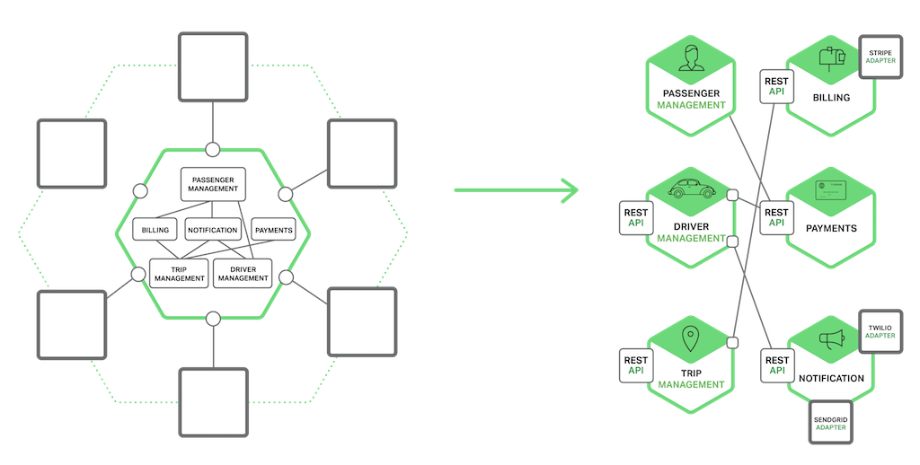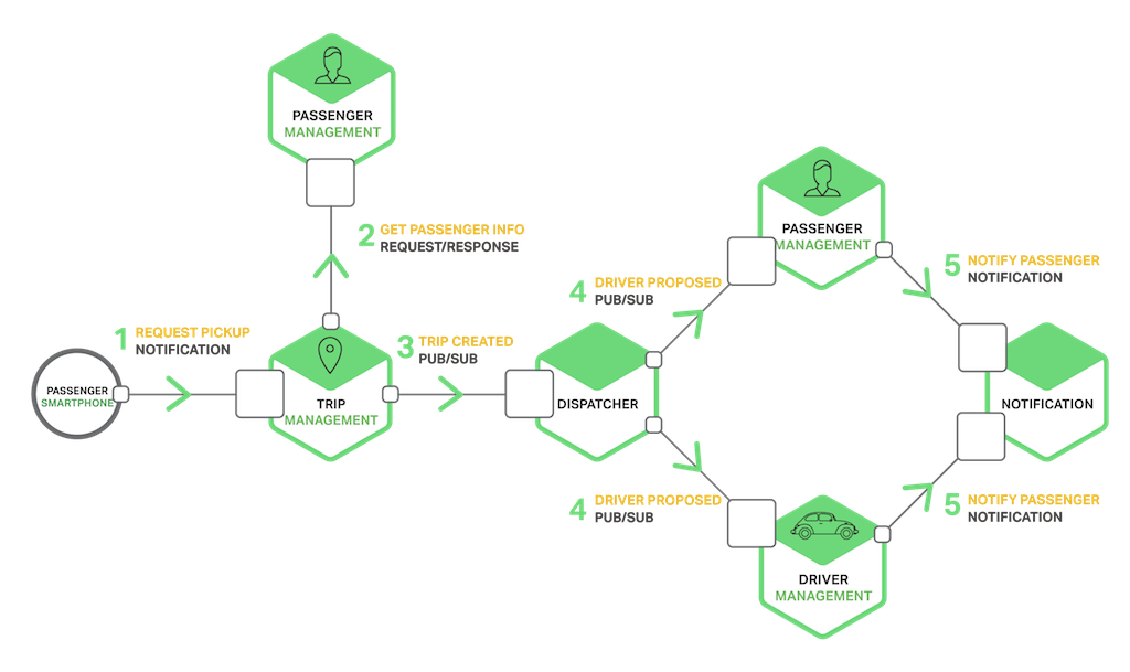 Điện thoại thông minh hành khách hành khách gửi thông báo đến dịch vụ Quản lý chuyến đi để yêu cầu đón khách. Dịch vụ Quản lý chuyến đi xác minh rằng tài khoản Hành khách đang hoạt động bằng cách sử dụng request/response để gọi Dịch vụ hành khách. Dịch vụ Quản lý chuyến đi sau đó tạo chuyến đi và sử dụng publish/subscribe để thông báo cho các dịch vụ khác bao gồm cả Người điều hành, nơi định vị một tài xế có sẵn.
