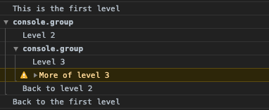 Khi làm việc với các tập hợp hoặc dữ liệu được liên kết, hãy sử dụng các nhóm lồng nhau để giúp tổ chức đầu ra của bạn bằng cách liên kết trực quan các thông báo liên quan. Để tạo một khối lồng nhau mới, hãy gọi console.group().