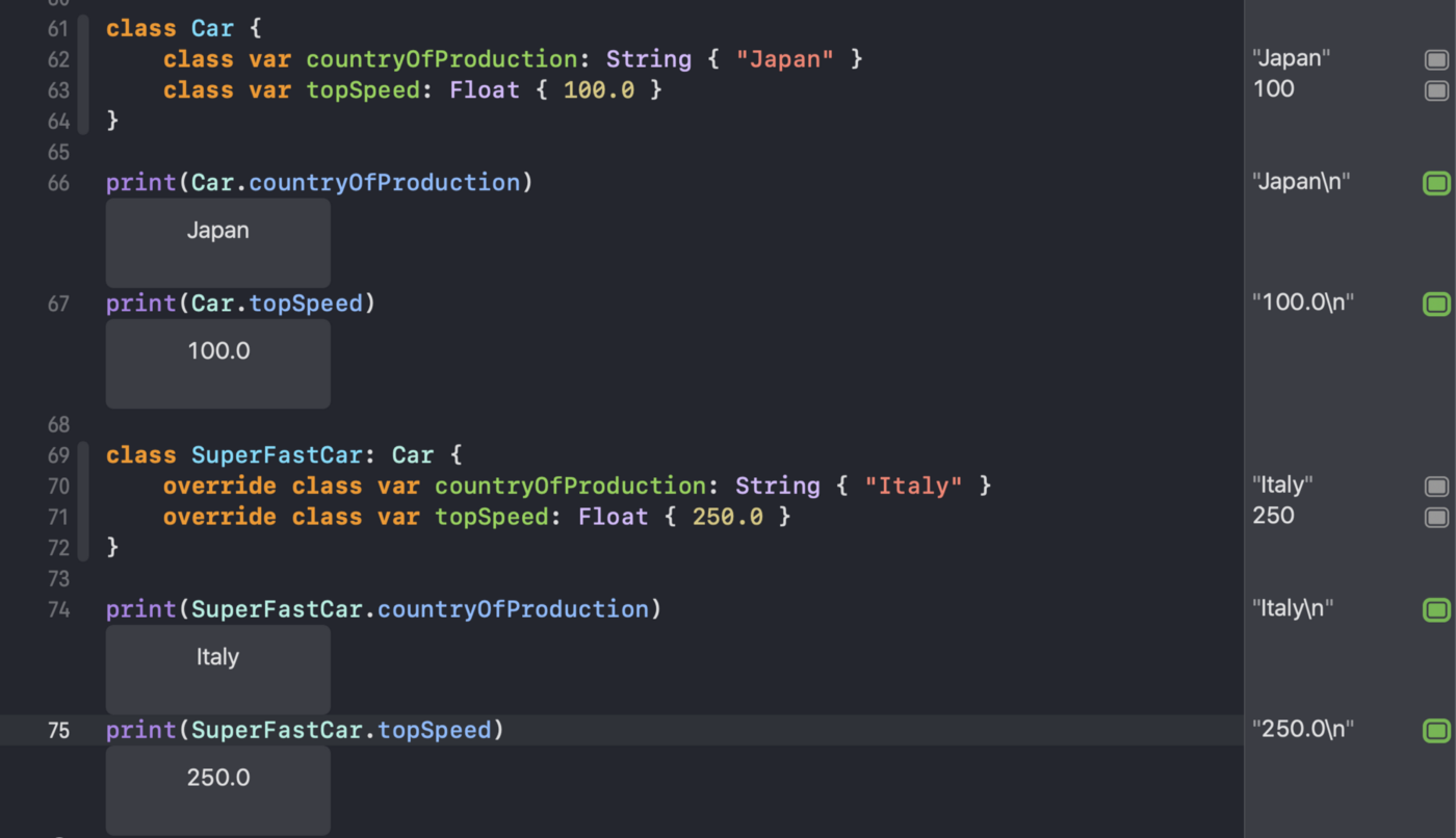 Vậy chúng ta phải làm sao để có thể ghi đè được các thuộc tính này? Chúng ta sẽ dùng từ khóa class thay vì sử dụng static (có một lưu ý ở đâu: chúng ta không thể sử dụng từ khóa classvới các thuộc tính lưu trữ)