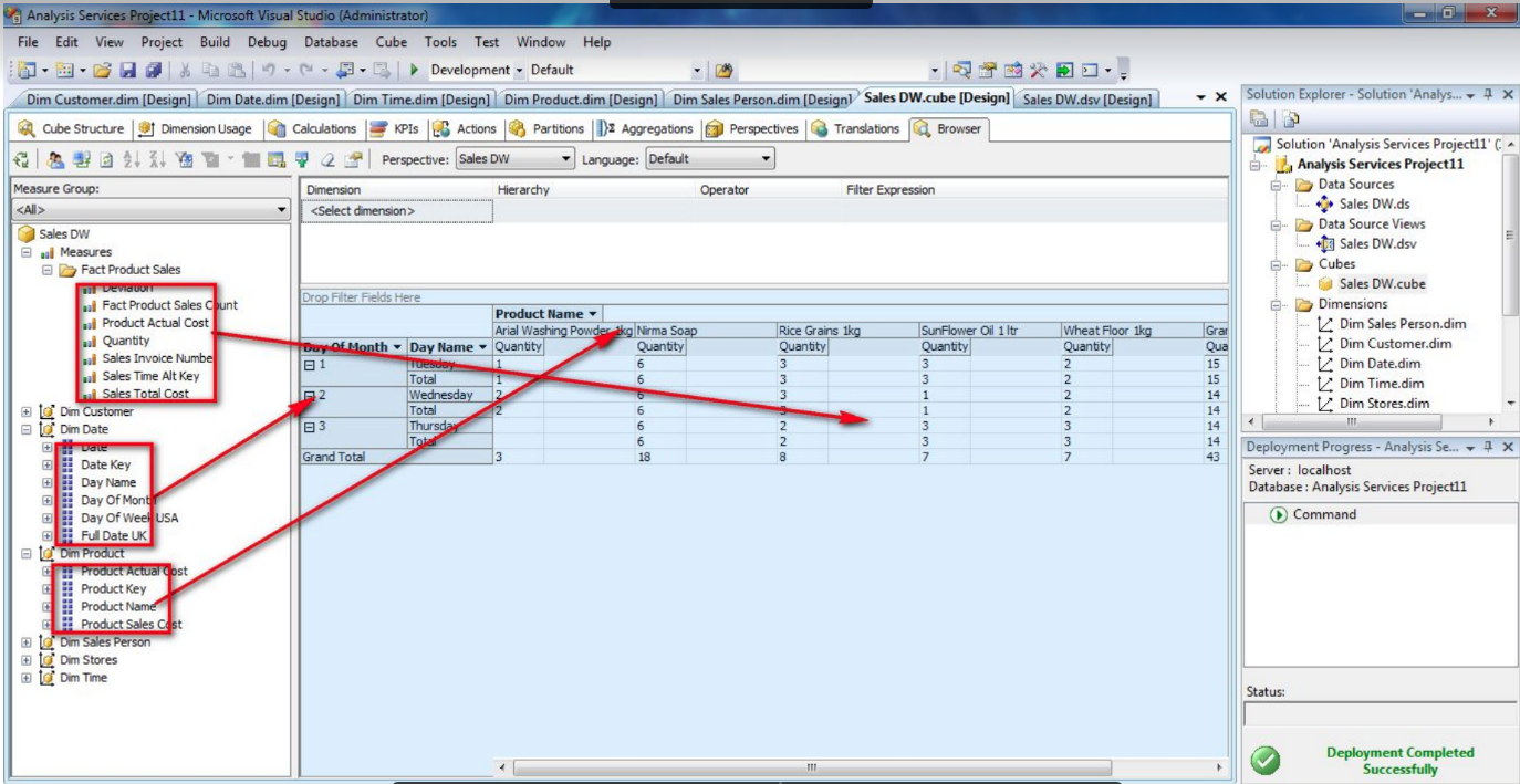 Như trên hình chúng ta có thể filter các kiểu truy vấn đa chiều (Dim Date, Dim Product, Dim Customer, DIm Times, ...) kết hợp với các bản ghi sẽ ra được các tổ hợp báo cáo khác nhau rất lơn, trong khi đó truy vấn thông thường như cơ sở dữ liệu sẽ không đáp ứng được.