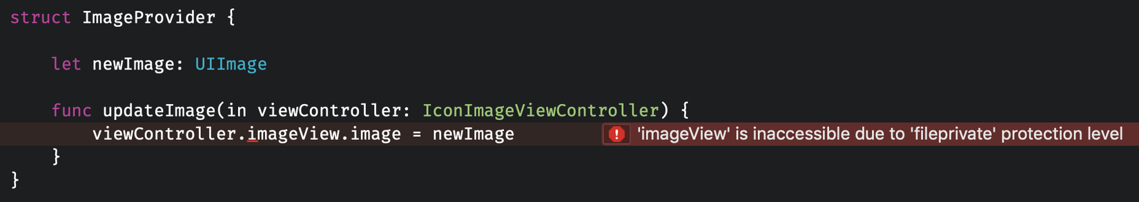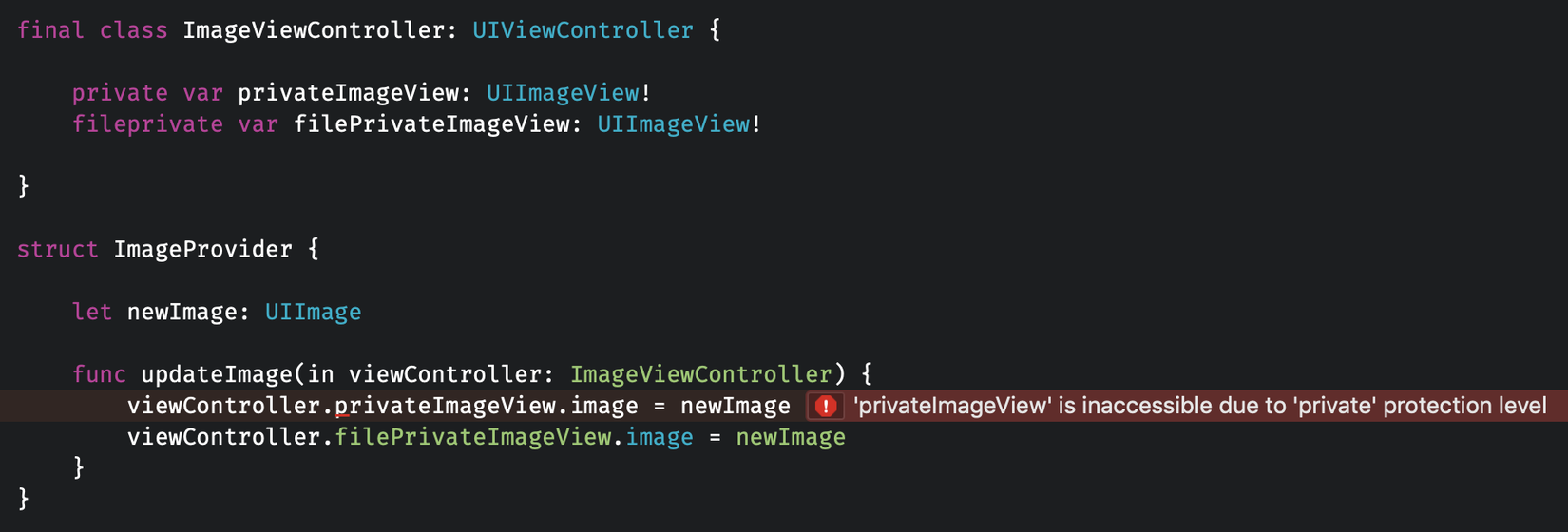 Trong ví dụ sau, chúng ta có mộtImageProvider và một ImageViewController. Chúng ta có thể sử dụng fileprivate nếu chúng được xác định trong cùng một tệp và chúng ta muốn cho phép truy cập vào image view từ ImageProvider