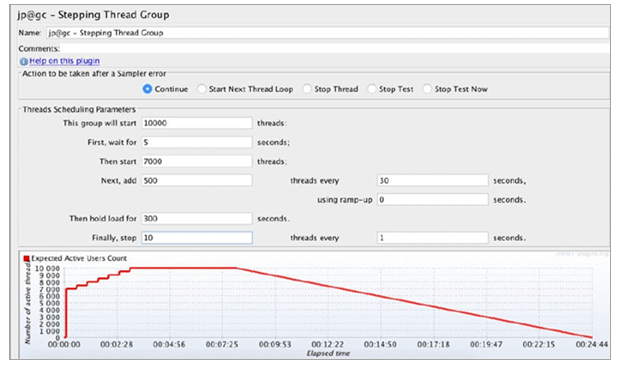 Hình trên mô tả một bài kiểm tra tải được thực hiện trong công cụ có tên là JMeter. Bài test này được thực hiện để xác định có bao nhiêu người dùng mà một hệ thống có thể xử lý. Trong thử nghiệm này, 100 người dùng được thêm sau mỗi 30 giây cho đến khi tải đạt 1000 người dùng. Mỗi bước mất 30 giây để hoàn thành và JMeter đợi trong 30 giây trước khi bắt đầu bước tiếp theo.