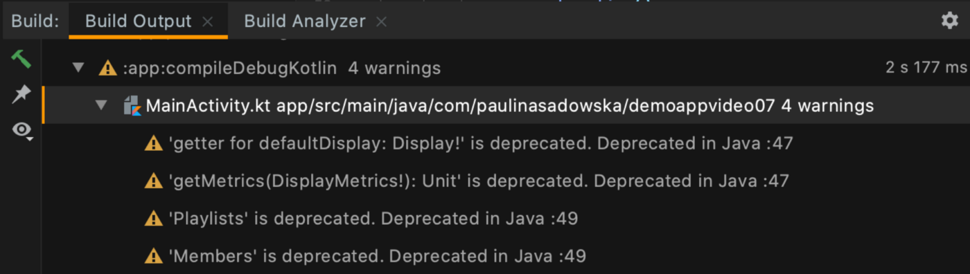 Tương tự, một số phương thức hoặc thuộc tính có thể sẽ bị deprecated (không được dùng nữa) trong phiên bản Android SDK này và một số phương pháp hoặc thuộc tính thậm chí còn bị xóa luôn. Đó là lý do tại sao khi ta cập nhật compileSdkVersion, ta sẽ thường thấy một số warning và error trong quá trình biên dịch mà ta phải giải quyết.