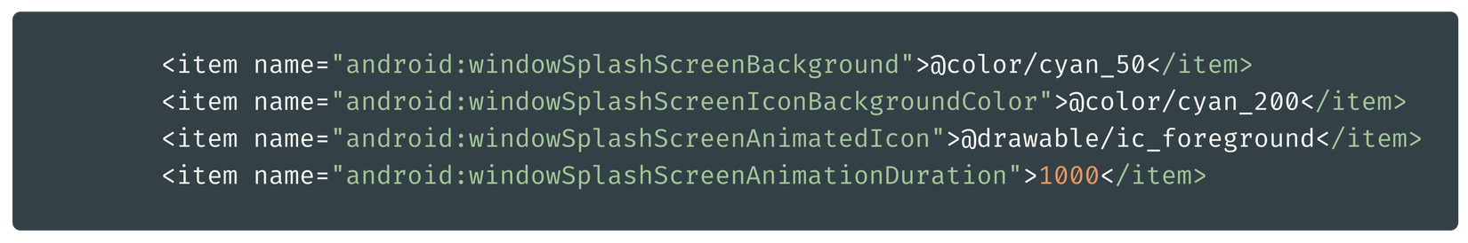 Trong Android 12, phiên bản Android SDK là 31, đã có một API mới được cung cấp, cho phép chúng ta dễ dàng triển khai một Splash Screen. Trong API mới này, Splash Screen có thể được tùy chỉnh bằng cách sử dụng các thuộc tính: