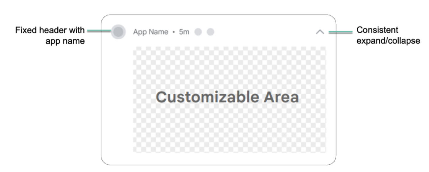 Trong Android 12, giao diện của các custom notification đã được thay đổi. Trước đây ta có thể sử dụng toàn bộ khu vực thông báo, nhưng trong Android 12 áp dụng template tiêu chuẩn cho tất cả các custom notification để chúng trông nhất quán hơn.