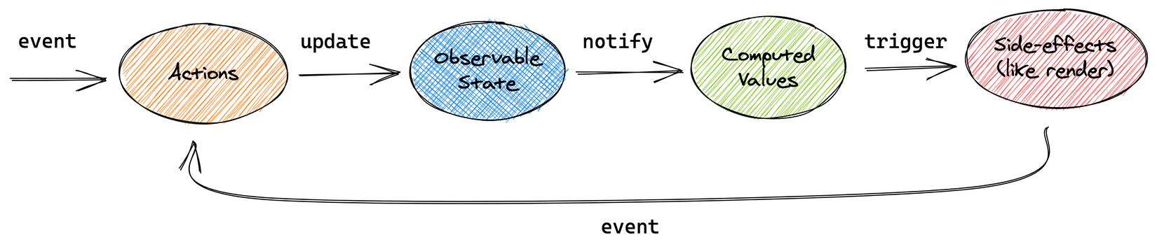 Flow hoạt động của Mobx sẽ gồm 4 bước chính như sau: