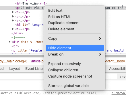 Với Chrome hoặc Firefox khi bật F12, trong lúc debug CSS bạn cũng có thể ẩn bất kỳ element nào bằng cách selector đến element đó và ấn phím h hoặc chuột phải chọn hide element.