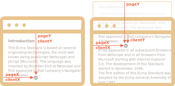 Toạ độ page bắt đầu từ vị trí trên cùng bên trái, toạ độ tính từ gốc <html>, hiểu nôm na là bắt đầu từ phần top: 0 / left: 0 của trang web, nó sẽ bao gồm các phần bị ẩn khi scroll. Toạ độ này cũng có thể ở bất kỳ đâu trong cửa sổ trình duyệt và có thể thay đổi vị trí nếu nó được embed vào trang khác khi người dùng scroll.