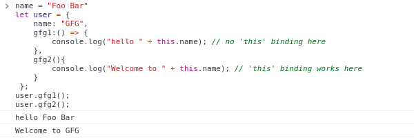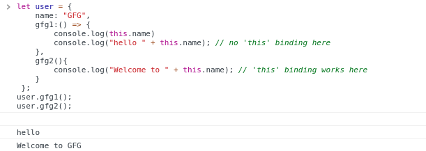 Chúng ta hãy cùng nhìn lại một chút. Ở đây gfg1được khai báo là một array fucntion nên cái this của nó không nằm ở user nữa mà nó là một cái gì đó ở ngoài user, có thể là window, document... Ngược lại thì gfg2 là một regular function nên this.name, nó sẽ hiểu là user.name, nên nó sẽ lấy giá trị của user.name