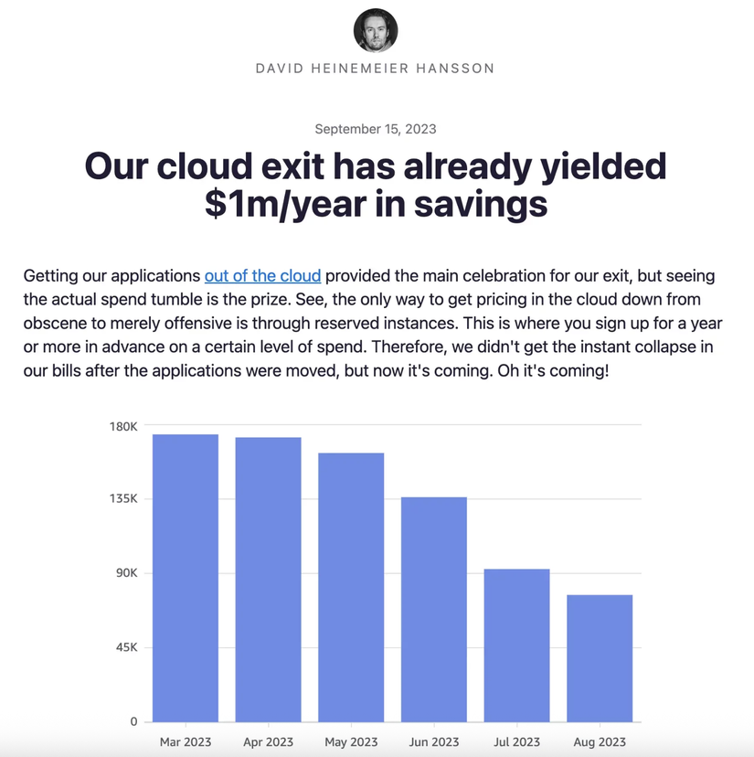 Hãy lấy ví dụ 37signals lần nữa. Sau khi di chuyển các dịch vụ Basecamp và HEY ra khỏi public cloud, họ dự báo tiết kiệm 7 triệu đô la trong 5 năm. Và đây là con số mặc dù có chi phí đầu tư vốn (CapEx) liên quan đến việc mua máy chủ riêng và bảo trì phần cứng.