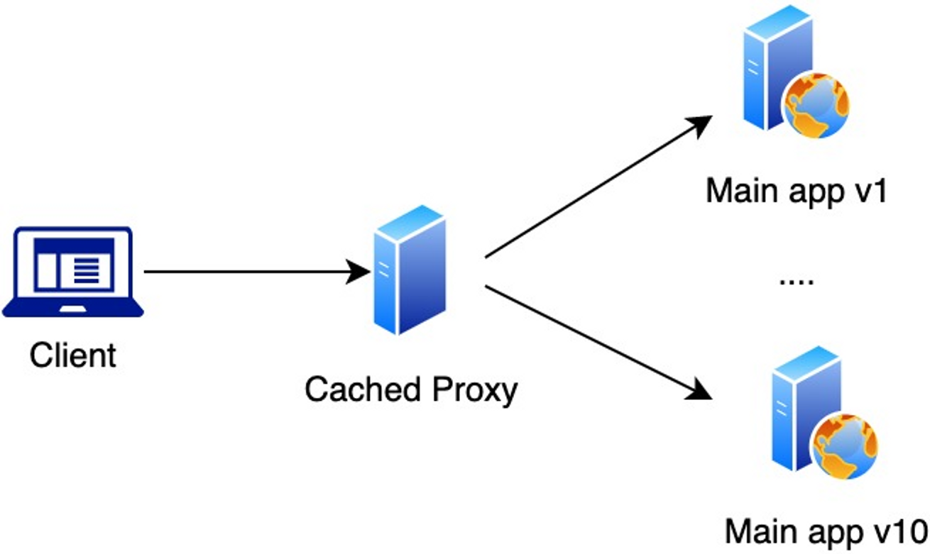 Thay vì web chính được phục vụ trực tiếp tới client thì chúng ta sẽ có 1 con proxy đứng ở giữa và cache lại tất cả các file đi qua. Kì vọng của chúng ta là khi Main app được update thì con Proxy vẫn còn cache những file cũ để phục vụ những client chưa update phiên bản mới.