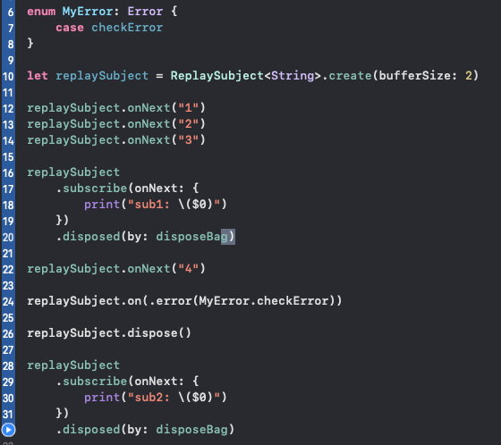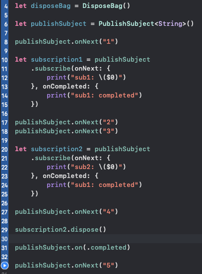 - Chúng ta muốn khi kết thúc khi subscriber mới đăng kí tới chỉ nhận được complete hoặc error thôi thì chúng ta sẽ sử dụng operator .dispose() để có thể xoá hết các value ở trong bộ đệm