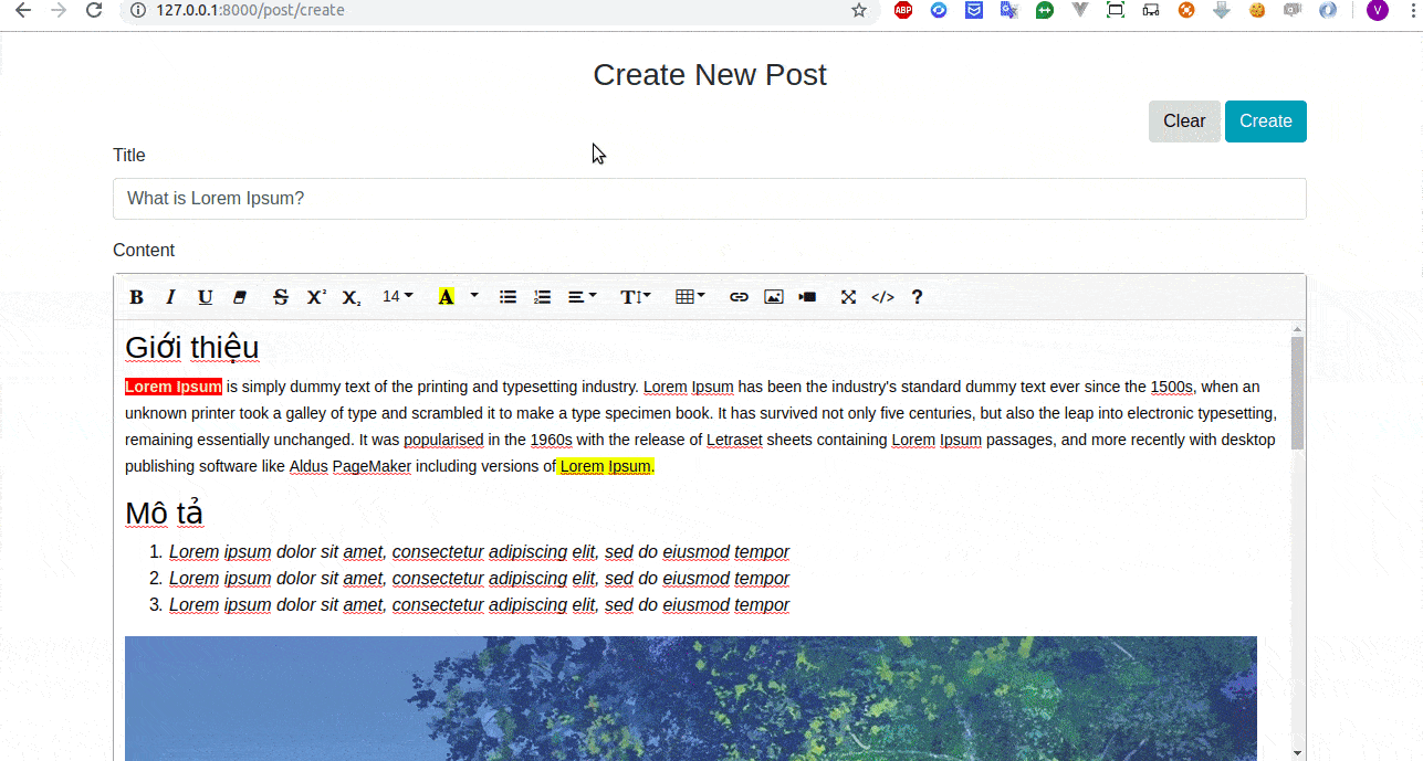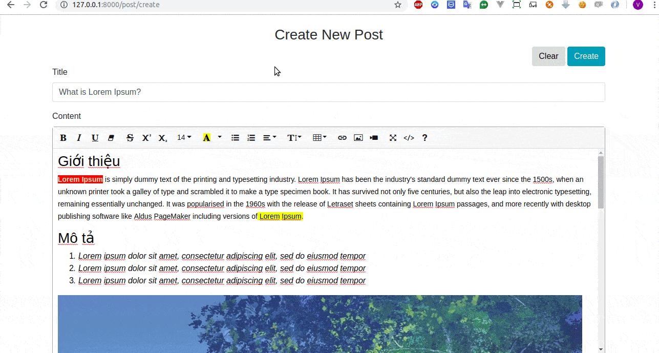 Mình có sử dụng Summernote với Larevel để làm một trang tạo bài viết đơn giản, và đây là kết quả