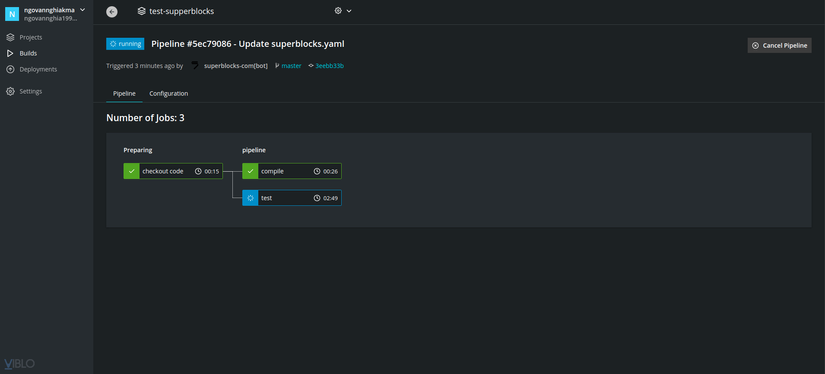 Pipelines thì được xác định bởi một nhóm các Jobs, sẽ được thực hiện theo một cách tuần tự, không tuần tự hoặc có thể xác định theo một chương trình (Stages). Một Pipeline trong Superblocks thì được mô tả bằng một configuration có name là superblocks.yaml. Khi một repository được kết nối với project, Superblocks sẽ đảm nhận việc thiết lập và chạy các pipeline mới. Pipelines sẽ phản hồi lại với các event được kích hoạt do các tương tác được thực hiện trong repository đã được connected.