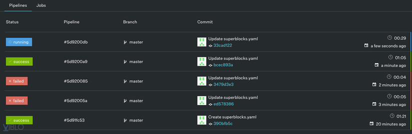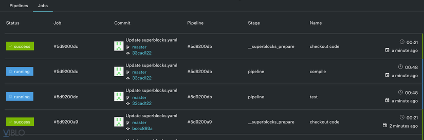 Màn hình Pipelines sẽ hiển thị tất các các actions thực hiện bằng Superblocks. Mỗi pipeline entry thì được mô tả như sau:
