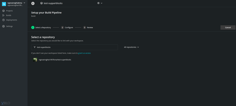 Set up cho việc build project, do đã connect với github nên chúng ta sẽ chỉ cần chọn Repo mong muốn