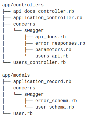 # app/controllers/concerns/swagger/users_api.rb module Swagger :: UsersApi extend ActiveSupport :: Concern include Swagger :: Blocks included do include Swagger::ErrorSchema swagger_path "/ users / {id}" do operation :get do key :description, "Returns the specified user" key :operationId, :find_user_by_id parameters :user_id # Include parameters defined by root response 200 do key :description, "User specified by its ID" schema do key :"$ref", :User end end # Captures the error response which is separately defined extend Swagger :: ErrorResponses :: NotFoundError end end end endBây giờ, cùng nhau nhìn lại cấu trúc project của chúng ta: