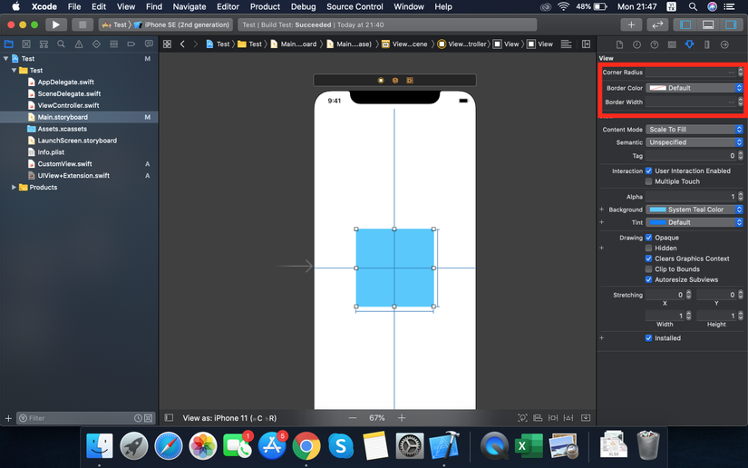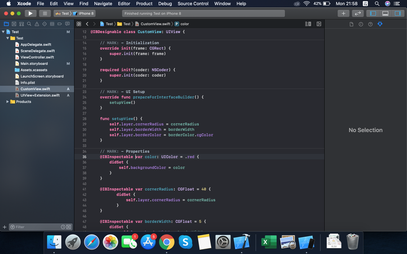 Ở đây mình tạo 1 class CustomView và kế thừa lại từ UIView. Mình thêm @IBDesignable vào trước class. Bên trong mình sẽ tạo ra các thuộc tính như color ( dùng để set background color), cornerRadius ( dùng để set cornerRadius), tương tự với borderWidth và borderColor. Mình tạo 1 function setupView() để set các thuộc tính cho view, và override lại phương thức prepareForInterfaceBuilder().