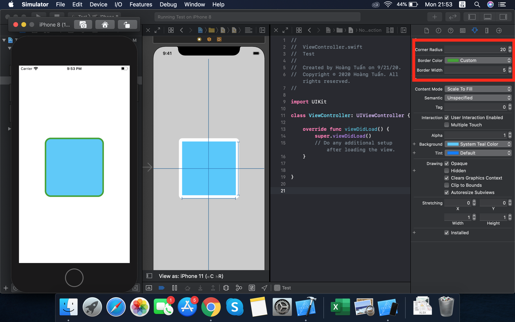 Ở đây mình mở rộng UIView và tạo ra các properties cornerRadius, borderColor, borderWidth để set các thuộc tính tương ứng cho view. Giờ quay lại storyboard xem có gì nhé.