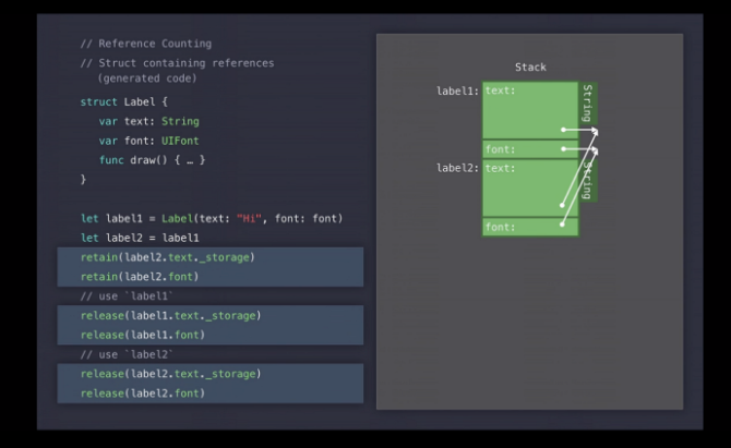 - Để lưu trữ trong class, đầu tiên Apple tìm thấy bộ nhớ trong Heap, sau đó duy trì trường bổ sung để đếm số "Retain count". Cũng vậy lưu trữ tham chiếu của Heap vào Stack. Vì vậy, khi nói đến phần truy cập, nó phải xử lí stack và heap. Xem hình ảnh ví dụ từ video của Apple sau: