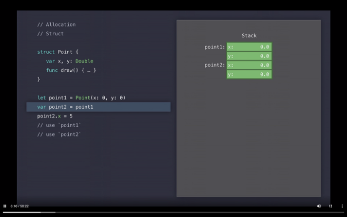 Hình ảnh trên là từ video WWDC của Apple, nơi họ đề cập rõ ràng rằng nếu chúng ta chỉ gán các biến cấu trúc, nó sẽ tiếp tục trỏ đến cùng một heap cho đến khi bất kỳ sửa đổi nào không được thực hiện.