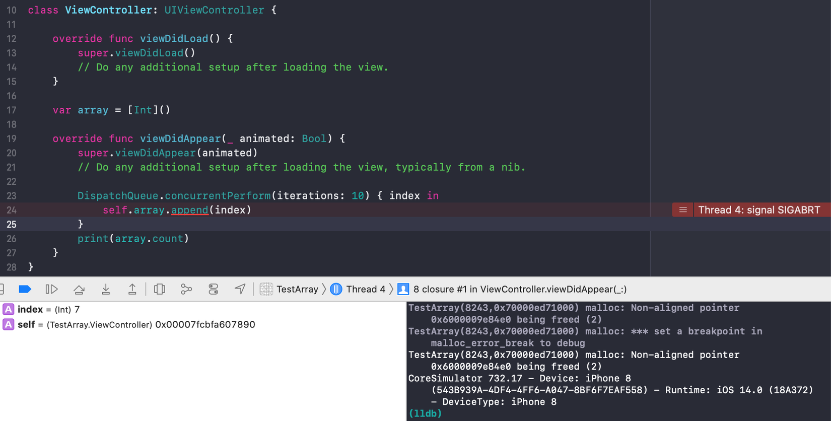 Lý do là vì các bộ Swift collection có kiểu Array hoặc Dictionary không phải là thread-safe khi nhiều thread cùng truy xuất, thay đổi array cùng một lúc - Nếu không crash, thì sẽ print ra những số lượng count khác nhau, không cố định ở mỗi lần print: