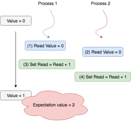 2 thread 1 và 2 chạy đồng thời, thread 1 đọc giá trị lên là 1 để tiến hành tăng 2, thread 1 chưa kịp set giá trị mới vào memory thì thread 2 đọc giá trị cũ là 1 và tăng lên 1. Sau đó cả hai cùng set giá trị 2 xuống memory. Kết quả chúng ta mong muốn sau 2 lần tăng 3 nhưng kết quả ghi xuống lại là 2 -> sẽ không an toàn nếu 1 thread đang thay đổi giá trị và 1 thread khác muốn đọc nó.