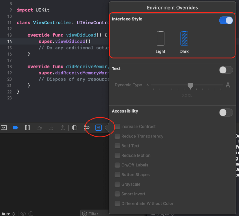 Khi bạn mở Xcode 11 beta trở lên, có một biểu tượng environment overrides, khi bạn chạy ứng dụng của mình trong simulator. Nhấp vào nó và sau đó bạn có thể chuyển chế độ tối trong simulator của mình.