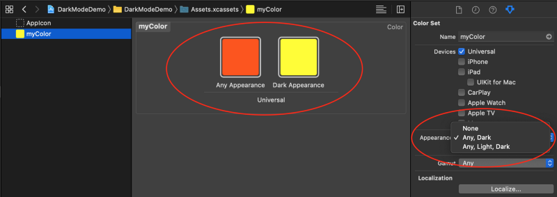 Điểm hay của việc thiết lập màu sắc hoặc hình ảnh trong Tài sản là nó tương thích ngược. Điều đó có nghĩa là bạn không cần phải gọi if #available(iOS13, *) trong mã của bạn. Hệ thống sẽ tự động sử dụng màu sắc hoặc hình ảnh chế độ ngày cho một ứng dụng chạy iOS 12 trở về trước.